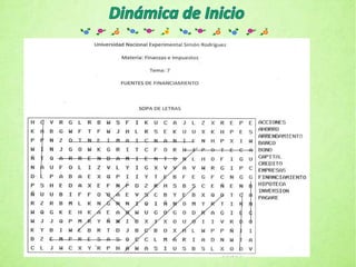 Este documento resume las fuentes de financiamiento. Identifican el origen de los recursos para cubrir asignaciones presupuestarias. Estos incluyen canales e instituciones bancarias y financieras internas y externas que proveen los recursos para equilibrar las finanzas públicas. También explica la financiación a corto plazo, cuya devolución es inferior a un año, y la financiación a largo plazo, cuya devolución es superior a un año o no tiene obligación de devolución. Cada fuente