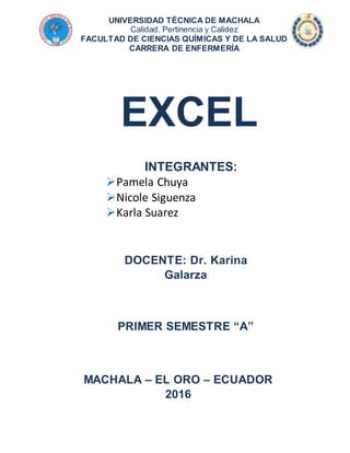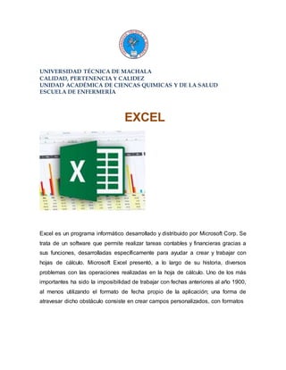 Este documento proporciona información sobre Excel 2013, incluyendo su entorno, cinta de opciones y formato de celdas. Brevemente describe las barras de título, herramientas, fichas y grupos en la cinta de opciones, así como opciones para formato de fuente, alineación y relleno de celdas.