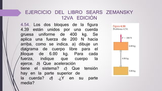 El documento presenta cuatro ejercicios resueltos de física. El primero involucra el cálculo de la aceleración de un sistema de bloques unidos por una cuerda. El segundo analiza la máxima fuerza requerida para mover bloques sobre una superficie. El tercero calcula la velocidad y trayectoria de un bloque deslizándose por un plano inclinado. El cuarto determina la aceleración de un bloque en movimiento relativo a otro bloque acelerado.