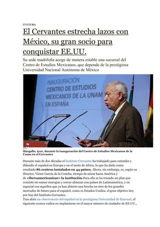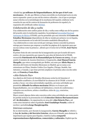El Instituto Cervantes estrecha lazos con México para expandir el español en EE.UU., donde la mayoría de hispanohablantes son mexicanos. Ahora alberga de manera permanente una sucursal del prestigioso Centro de Estudios Mexicanos de la Universidad Nacional Autónoma de México para promover el intercambio académico y difundir la cultura mexicana a través de eventos como la presentación de la Colección Clásicos Iberoamericanos y el Año Octavio Paz en 2014. El ministro de Asuntos