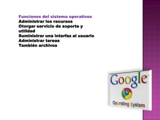El documento proporciona información sobre sistemas operativos, incluyendo sus funciones principales como administrar recursos, proveer interfaz de usuario y administrar tareas. También describe brevemente varios sistemas operativos populares como Windows XP, GNU/Linux, Unix y las tarjetas fax-módem.