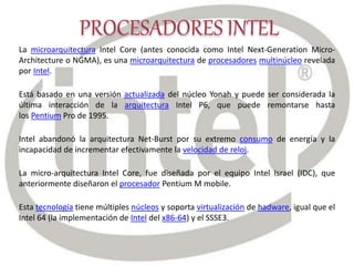 La microarquitectura Intel Core fue revelada por Intel para procesadores multinúcleo. Está basada en una versión actualizada del núcleo Yonah y representa la última iteración de la arquitectura Intel P6. Abandonó la arquitectura Net-Burst debido a su alto consumo de energía. Los primeros procesadores en usar esta arquitectura fueron Merom, Conroe y Woodcrest.