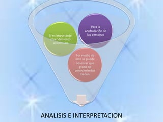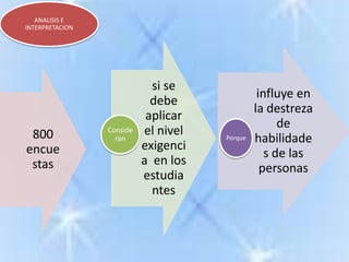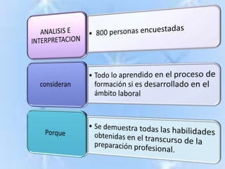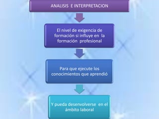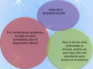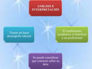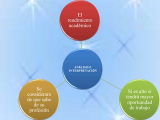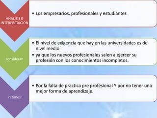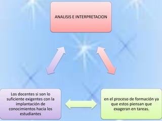 El documento analiza la exigencia de formación docente y su repercusión en el rendimiento académico de estudiantes de ingeniería y administración en Ambato entre septiembre 2010 y febrero 2011. Incluye encuestas que examinan la percepción sobre la exigencia educativa, su aplicación en el ámbito laboral y la importancia del rendimiento académico para la contratación. Los resultados sugieren que un mayor rendimiento académico está asociado a mejores oportunidades laborales.