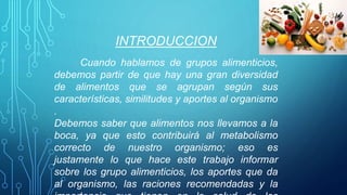 El documento describe los siete grupos alimenticios principales y sus aportes nutricionales al organismo. Los grupos son: 1) leche y derivados, 2) carnes, pescados y huevos, 3) patatas, legumbres y frutos secos, 4) verduras y hortalizas, 5) frutas, 6) cereales y derivados, y 7) grasas, aceites y mantequilla. Cada grupo proporciona nutrientes específicos como proteínas, vitaminas, minerales o hidratos de carbono que son esenciales