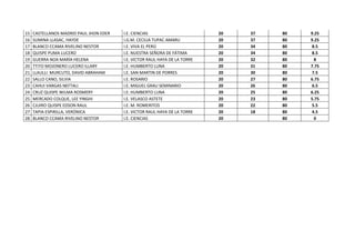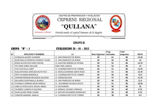 Este documento presenta los resultados de una evaluación realizada a dos grupos de estudiantes. Proporciona información como los nombres y apellidos de los estudiantes, la institución educativa a la que asisten, la nota obtenida en la evaluación y el total de preguntas respondidas.