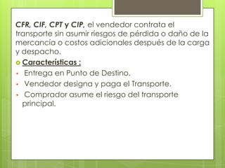 Las siglas CFR, CIF, CPT y CIP se refieren a términos de comercio internacional que especifican las obligaciones de los compradores y vendedores en una transacción. CFR significa que el vendedor paga el costo y flete de la mercancía hasta el puerto de destino acordado, CIF significa que también paga el seguro, CPT significa que paga el transporte hasta el lugar de destino acordado, y CIP significa que paga el transporte y el seguro hasta ese lugar.