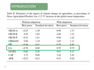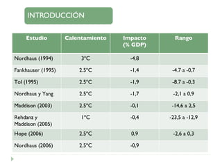 El documento presenta un resumen de varios estudios sobre los costos económicos del cambio climático, reportando rangos de impacto en el PIB de entre -8.7% a 2.5% para un aumento de temperatura de 2.5°C. Señala que los impactos serán mayores en países en desarrollo y que el Perú podría experimentar un aumento de hasta 1.6°C en la temperatura máxima y hasta 1.4°C en la mínima, con mayores incrementos en la costa norte. Finalmente, destaca la capacidad de investig