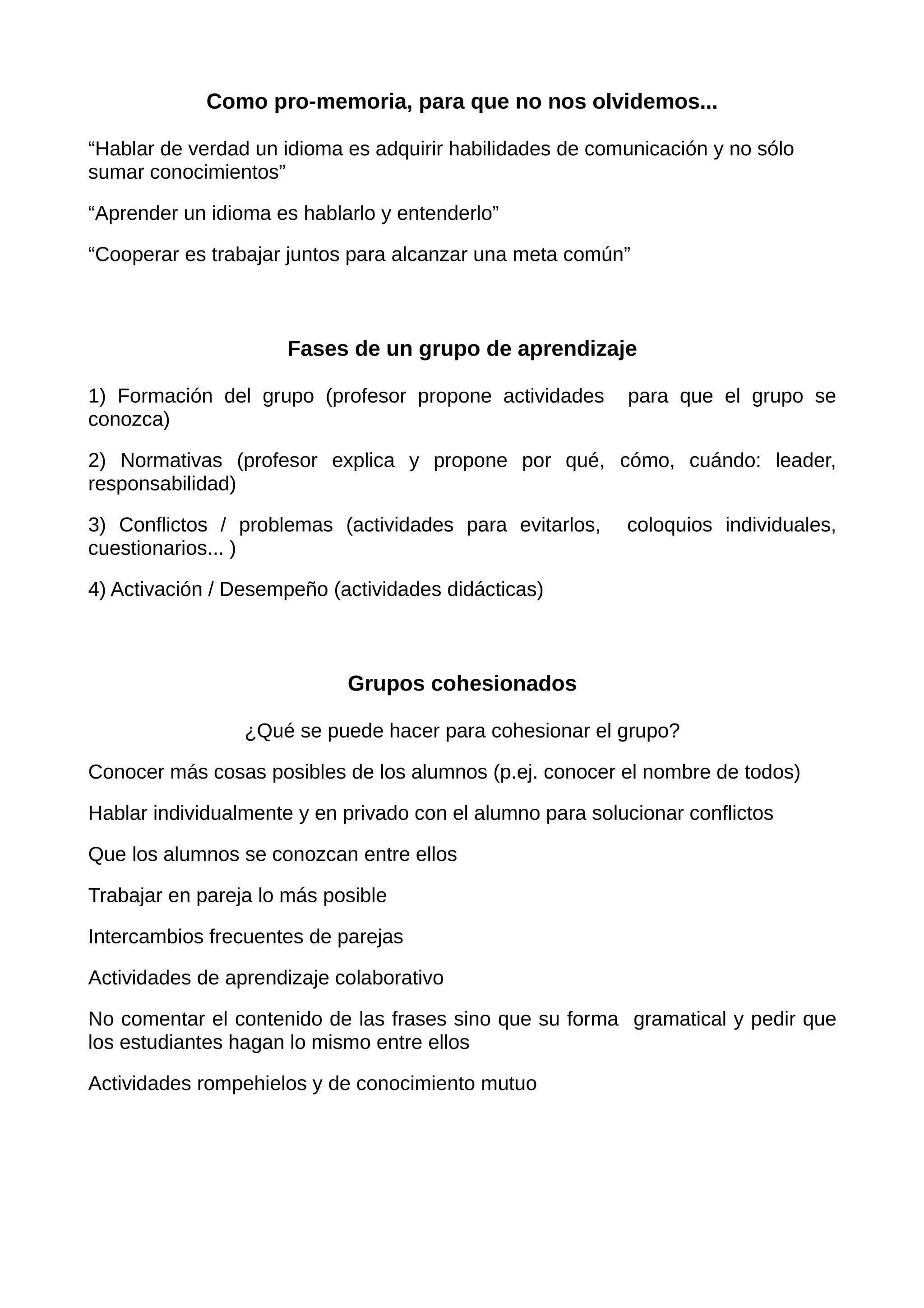 El documento describe las fases de formación de un grupo de aprendizaje y las características de un grupo cohesionado. Las fases incluyen la formación del grupo, establecer normas, abordar conflictos y realizar actividades didácticas. Las características de un grupo cohesionado son compromiso, interés, cooperación, diversión, resolución de problemas, involucramiento de todos y aprendizaje mejorado. El profesor actúa como mediador, optimizador del aprendizaje, punto de referencia y dinamizador.