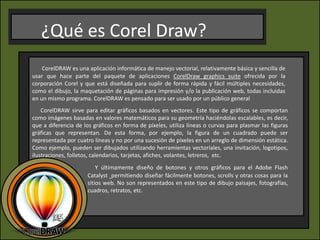 Corel Draw es una aplicación de edición gráfica vectorial que permite crear y editar imágenes, logotipos e ilustraciones de forma sencilla. Ofrece herramientas para dibujar, importar imágenes, agregar texto, crear formas geométricas y ordenar los objetos. El documento explica cómo usar estas herramientas básicas para crear un poster combinando imágenes, texto y figuras.