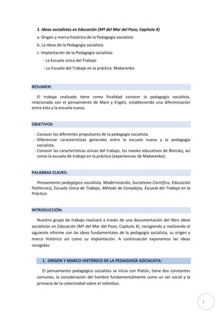 El documento resume las ideas principales de la pedagogía socialista, su origen en el pensamiento de Marx, Engels y otros socialistas utópicos. Explica las características de la Escuela Única del Trabajo establecida en Rusia en 1918, incluyendo los tres niveles educativos de Blonskij. También analiza las experiencias prácticas de Makarenko en las colonias para formar al "nuevo hombre soviético" a través de la unión de la educación y el trabajo productivo.