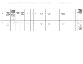 Este documento resume 14 factores de riesgo en el trabajo y propone métodos de control para cada uno. Algunos de los riesgos incluyen estado de escaleras deterioradas, humedad en el baño, techos en mal estado y posturas corporales inadecuadas al usar la computadora. Se recomiendan soluciones como cambiar la escalera, secar el baño después de usarlo, arreglar el techo y mejorar la postura ergonómica. El objetivo es reducir los riesgos y prevenir accidentes o problemas de salud en el trabajo.
