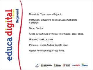 Este documento describe un proyecto para formar estudiantes en la Institución Educativa Técnica Lucas Caballero Calderón en Tipacoque, Boyacá, Colombia como ciudadanos integrales activos a través del uso de las tecnologías de la información y la comunicación (TIC). El proyecto busca enseñar competencias ciudadanas utilizando herramientas TIC como blogs, wikis y redes sociales para involucrar a los estudiantes en su propio aprendizaje.