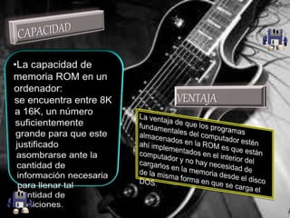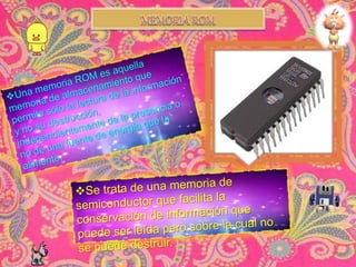 La memoria ROM almacena programas de inicio y datos básicos como la configuración del sistema. Existen tres tipos principales de memoria ROM: PROM, que permite una única programación; EPROM, que puede borrarse con luz UV; y EEPROM, que permite la modificación eléctrica de datos sin necesidad de programadores. La memoria ROM verifica la configuración del sistema y carga el sistema operativo al iniciar la computadora.