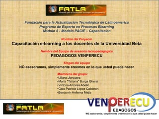 El documento presenta un plan para capacitar a los docentes de la Universidad Beta en e-learning utilizando la metodología PACIE. El equipo PEDAGOGOS VENPERECU propone crear un Departamento de Educación en Línea para coordinar la implementación de la metodología en 5 fases: Presencia, Alcance, Capacitación, Formación y Cronograma Total. La capacitación incluirá dotar de equipos a docentes y configurar plataformas virtuales para que los 160 docentes puedan recibir capacitación en estrategias ped