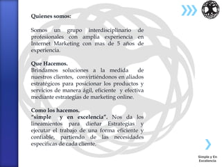 Este documento presenta a Simple y en Excelencia, un grupo de profesionales con más de 5 años de experiencia en marketing digital que ofrece servicios como el desarrollo y optimización de sitios web, email marketing, redes sociales, posicionamiento SEO y PPC, campañas publicitarias, mercadeo en video, webinars y más, siguiendo un proceso de diagnóstico, diseño, ejecución y seguimiento para brindar soluciones a la medida de cada cliente de manera eficiente y confiable.