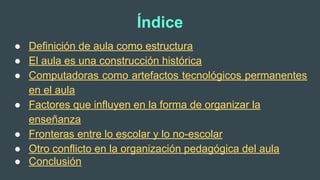 El documento aborda los cambios en la organización pedagógica del aula, destacando cómo las nuevas tecnologías, especialmente las computadoras y los dispositivos móviles, redefinen tanto la estructura material como la interacción en el espacio educativo. Se enfatiza que la organización del aula debe adaptarse a la diversidad de estudiantes y requerimientos específicos, lo que exige capacitación y nuevas estrategias por parte del docente. Además, se menciona la importancia del conocimiento tácito y el impacto de los nuevos medios digitales en el agrupamiento social y el aprendizaje individualizado.