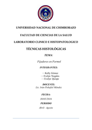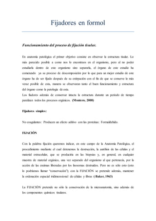 El documento describe los fijadores de tejidos utilizados en anatomía patológica, con un enfoque en el formol. Explica que el formol fija los tejidos al unirse a proteínas celulares, evitando la autólisis. También discute cómo preparar soluciones de formol bufferado, los tiempos y temperaturas de fijación, y el poder de penetración de diferentes fijadores.