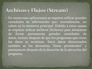 Los ficheros son necesarios para almacenar grandes cantidades de datos de forma permanente, incluso después de que los programas que los crean se hayan terminado. Los ficheros organizan los datos en registros relacionados entre sí y permiten el acceso secuencial y directo a los registros. Es importante comprender la utilidad de los ficheros para guardar información de forma permanente, a diferencia de los arrays que solo almacenan datos en memoria mientras se ejecuta el programa.