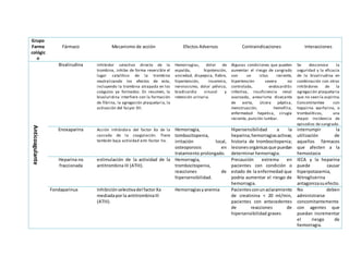 El documento resume las propiedades de varios fármacos anticoagulantes y antiagregantes plaquetarios, incluyendo su mecanismo de acción, efectos adversos comunes, contraindicaciones e interacciones. Los fármacos discutidos incluyen aspirina, abciximab, bivalirudina, enoxaparina, heparina no fraccionada, fondaparinux y warfarina.