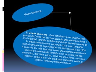 Este documento proporciona información sobre los últimos móviles de gama media y alta lanzados por Samsung, incluyendo el nombre, sistema operativo, características y fecha de lanzamiento de cada dispositivo. Se describen teléfonos como el Samsung Galaxy S, Galaxy Note, Omnia y Wave, que ejecutan sistemas operativos como Android, Windows Mobile y Bada OS. El documento también incluye una breve historia de los logotipos de Samsung a través de los años.