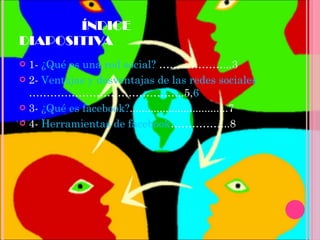 Este documento trata sobre las redes sociales. Define una red social como una estructura compuesta de grupos de personas conectadas por amistades, familia u otros intereses en común. Explica las ventajas de las redes sociales como mantenerse en contacto con otros y compartir fotos e información, pero también las desventajas como la exposición de información privada y la posible adicción. Luego describe a Facebook como un sitio web de redes sociales fundado originalmente para estudiantes de Harvard y ahora disponible para cualquier persona, permitiendo conectarse con otros bas