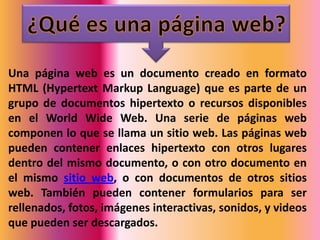 Una página web es un documento HTML que forma parte de la World Wide Web. Un conjunto de páginas web componen un sitio web. Las páginas web pueden contener hipervínculos a otras páginas dentro del mismo sitio o de otros sitios. Los sitios web pueden clasificarse en sitios de archivo, sitios de empresas o sitios de comercio electrónico.