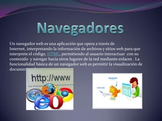 Un navegador web es una aplicación que permite a los usuarios navegar e interactuar con sitios y páginas web. Los navegadores más populares incluyen Internet Explorer de Microsoft, Mozilla Firefox de código abierto, Safari de Apple, Opera y Google Chrome. Cada navegador tiene su propio creador y sistema operativo compatible.