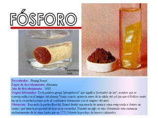 El documento describe las diferentes formas alotrópicas del fósforo y sus propiedades. El fósforo se presenta en varias formas alotrópicas, incluyendo fósforo blanco, rojo y negro. El fósforo blanco es una sustancia molecular compuesta de moléculas de P4 tetraédricas, mientras que el fósforo rojo es una forma cristalina y el fósforo negro es amorfo y pirolítico.