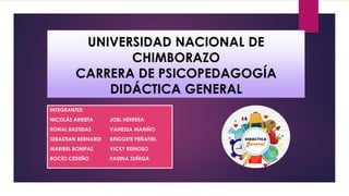 El documento presenta información sobre didáctica general en la carrera de psicopedagogía de la Universidad Nacional de Chimborazo. Se describen diferentes metodologías y estrategias de enseñanza como el aprendizaje basado en problemas, el estudio de casos, el trabajo en grupo y los principios de interacción social y aprendizaje cooperativo.