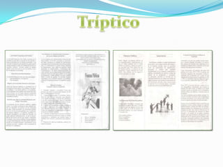 El documento habla sobre las finanzas públicas. Define las finanzas como el estudio de la circulación del dinero y cómo analiza la obtención, gestión y administración de fondos. Explica que lo público se refiere a lo que es común a toda la sociedad. Las finanzas públicas dependen de las políticas de gasto público e impuestos y determinan la estabilidad económica de un país y si entra en déficit o superávit. También describe brevemente el origen y desarrollo de las finanzas como un campo de estudio independiente