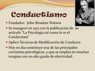 La escuela psicológica del conductismo fue fundada por John Broadus Watson en 1913. Se centra en la modificación de la conducta a través de técnicas de estímulo-respuesta y ha demostrado ser efectiva en terapias. El conductismo propone estudiar la psicología como una ciencia objetiva basada únicamente en observaciones externas.