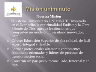 El documento presenta la misión y visión del Sistema Universitario UNIMINUTO. Su misión es ofrecer educación superior de calidad y accesible para formar profesionales éticos que contribuyan a la transformación social del país. Su visión es ser reconocido en 2012 por su aporte al desarrollo nacional a través de programas académicos de alta calidad con amplia cobertura e impacto.