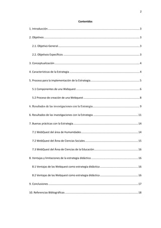 Este documento analiza el uso de las Webquest como herramienta TIC para la enseñanza del idioma inglés en educación superior. Explica que las Webquest son actividades didácticas guiadas por el docente que usan recursos de Internet para motivar a los estudiantes y lograr un aprendizaje significativo. Describe los componentes, características y proceso de implementación de las Webquest, incluyendo introducción, tarea, proceso, recursos y evaluación. Finalmente, analiza ventajas y limitaciones de esta estrategia para mejorar la enseñ