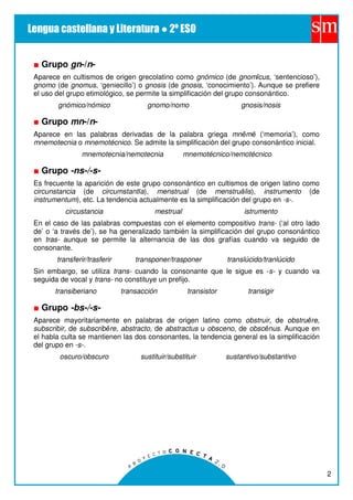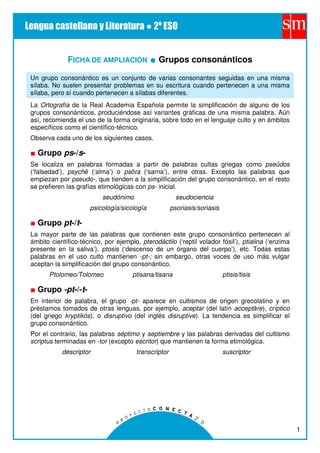 Este documento describe diferentes grupos consonánticos que aparecen en el español y las variantes gráficas permitidas. Explica que un grupo consonántico consiste en varias consonantes seguidas en una misma sílaba. Luego, analiza grupos específicos como ps-/s-, pt-/t-, -pt-/-t-, gn-/n-, mn-/n-, -ns-/-s-, y -bs-/-s- y discute si se prefiere la forma etimológica o la simplificación en cada caso.