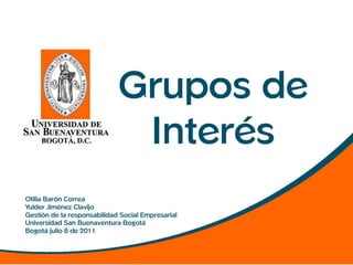 Los grupos de interés o stakeholders son actores sociales que se relacionan con una empresa y pueden verse afectados positiva o negativamente por sus acciones. La empresa tiene responsabilidades y obligaciones hacia diferentes grupos de interés como empleados, clientes, proveedores, accionistas e inversores, comunidades y el gobierno. Los stakeholders incluyen grupos primarios con un interés directo en la empresa y grupos secundarios con un interés público.