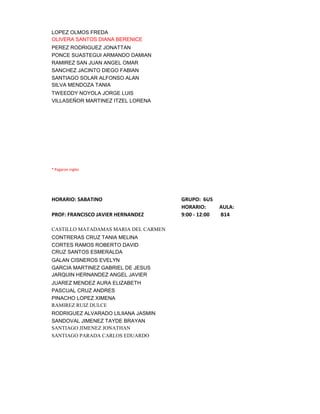 El documento contiene 3 horarios de clases de inglés los sábados. El primer horario es para el nivel 2 de 9-12pm en el aula E29 con la profesora Dalia Pachuca. El segundo horario es para el nivel 6 de 9:10-12pm en el aula B15 con la profesora Biani Sanchez. El tercer horario es para el grupo 6US de 9-12pm en el aula B14 con el profesor Francisco Hernandez.