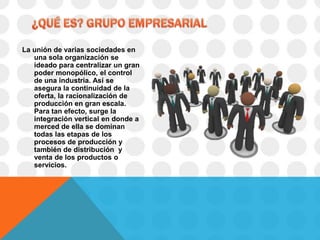 La concentración de varias sociedades bajo un mismo control permite centralizar el poder y controlar toda la cadena de producción y distribución de un producto o servicio. Esto asegura la continuidad de la oferta y permite realizar economías de escala. Se considera que existe una unidad de propósito y dirección cuando las subordinadas persiguen los objetivos de la controlante bajo su dirección, pero mantienen su autonomía individual.