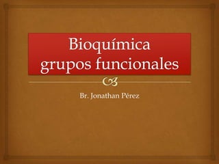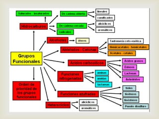 El documento proporciona información sobre diferentes grupos funcionales orgánicos, incluyendo sus propiedades, nomenclatura y clasificación. Se describen grupos como el hidroxilo, carbonilo, carboxilo, amino y sulfhidrilo. Para cada grupo se explica brevemente su fórmula, cómo se nombrar compuestos que los contengan, y características físicas y químicas relevantes.