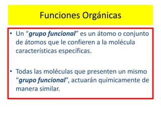 Este documento describe los principales grupos funcionales orgánicos, incluyendo alcoholes, aldehídos, cetonas, ácidos carboxílicos, ésteres, éteres, aminas y amidas. Para cada grupo funcional, se proporciona una breve definición y las convenciones de nomenclatura utilizadas para nombrar moléculas que contengan ese grupo funcional.