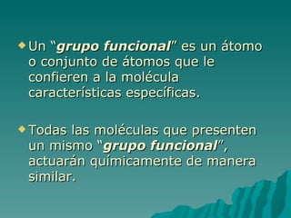 El documento describe diferentes grupos funcionales comunes encontrados en moléculas orgánicas, incluyendo alcoholes, aldehídos, cetonas, ácidos carboxílicos, ésteres, anhídridos, éteres, amidas, nitrilos y aminas. Explica sus propiedades químicas, cómo se nombran y clasifican, y cómo se pueden identificar en moléculas orgánicas.