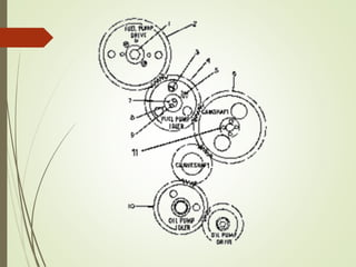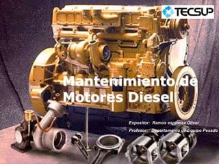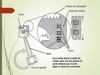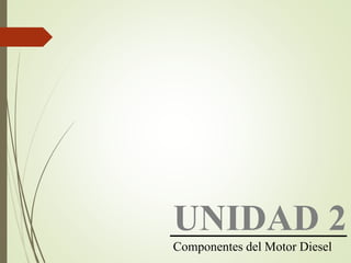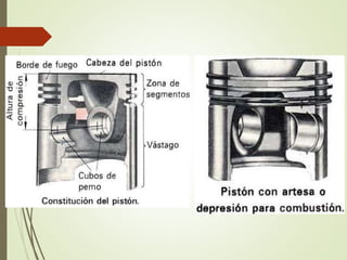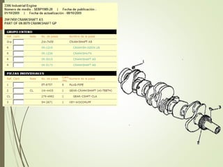 Este documento presenta los componentes principales del motor diesel, incluyendo el bloque del motor, pistones, bielas, cigüeñal, culata, válvulas, balancines y árbol de levas. Explica la función de cada componente y proporciona detalles sobre los materiales y diseños utilizados en los motores Caterpillar en comparación con la competencia.