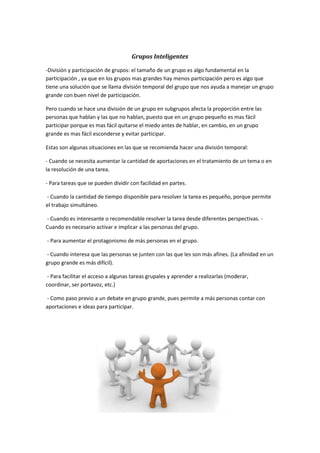 Este documento describe diferentes aspectos de los grupos inteligentes. Explica que dividir un grupo grande en subgrupos más pequeños ayuda a aumentar la participación. También describe diferentes tipos de interacciones entre los miembros de un grupo, como la adición, oposición y multiplicación de ideas. Por último, presenta varias técnicas útiles para los grupos de trabajo, como la tormenta de ideas y la escucha inteligente.