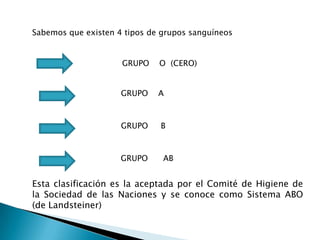 El documento describe los 4 principales grupos sanguíneos (O, A, B, AB) y cómo los carbohidratos en las glucoproteínas de los glóbulos rojos determinan los antígenos específicos de cada grupo. Explica que durante una transfusión, la aglutinación ocurre cuando los anticuerpos de un grupo atacan los antígenos de otro grupo incompatible, pudiendo causar la muerte. Finalmente, resume las compatibilidades de donación y recepción entre los grupos, señalando que el grupo O puede donar a todos, y