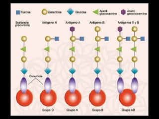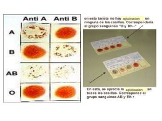 El documento resume la historia del descubrimiento de los grupos sanguíneos ABO y Rh, así como los antígenos y anticuerpos asociados. Explica que Landsteiner descubrió las diferencias entre los grupos sanguíneos en 1900 y que posteriormente se descubrieron los grupos M, N, P en 1918 y el factor Rh en 1939. Detalla los principales antígenos y anticuerpos involucrados en los sistemas ABO y Rh, así como los métodos para su detección.