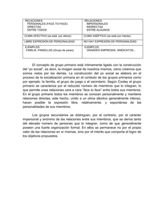 Este documento resume las diferencias entre grupos formales e informales, y entre grupos primarios y secundarios según Elton Mayo y Charles Cooley. Los grupos formales son planificados y racionales, orientados a los fines de la organización. Los grupos informales son espontáneos, afectivos y orientados a las necesidades personales. Los grupos primarios son pequeños, con relaciones personales y afectivas, e influyen en la construcción de la identidad social. Los grupos secundarios son grandes, con relaciones impersonales e indirectas, y se caracterizan por