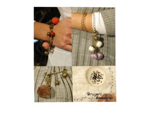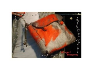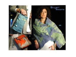 Este documento promociona prendas de vestir y accesorios hechos a mano utilizando lana merino y fibras naturales como algodón y seda. Los productos incluyen chalinas, bufandas y bolsos de fieltro con texturas generadas entre la lana y otras fibras. El documento invita a visitar el blog de la marca para más detalles.