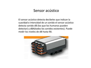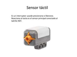 Este documento describe diferentes sensores y componentes del robot NXT, incluyendo el sensor táctil, sensor acústico, sensor fotosensible, sensor ultrasónico, servomotores, lámparas y Bluetooth. Cada uno detecta estímulos diferentes como sonido, luz, distancia y movimiento, y permiten al robot percibir y responder a su entorno.