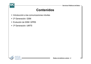 Este documento resume las redes de telefonía celular GSM y UMTS. Explica brevemente la historia y evolución de las comunicaciones móviles, describiendo las primeras generaciones analógicas y la segunda generación digital GSM. También describe la arquitectura de GSM y los componentes clave como la estación móvil, la estación base y la red de conmutación y conmutación. Por último, introduce la tercera generación UMTS y su evolución futura.