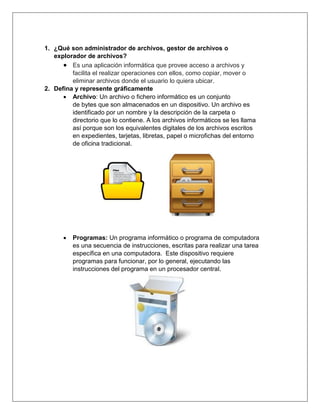 Este documento resume los conceptos básicos de administración de archivos en un sistema operativo. Explica que un administrador de archivos permite al usuario acceder y realizar operaciones con archivos como copiarlos o moverlos. Describe la estructura básica de archivos, carpetas, unidades de almacenamiento y programas, y resume los tipos comunes de operaciones con archivos como seleccionar, crear, mover y proteger archivos. Finalmente, enumera algunos tipos comunes de archivos como documentos de Word, PDF, hojas de cálculo de Excel