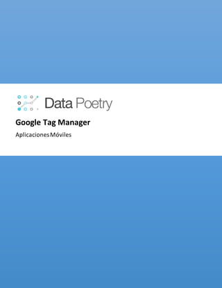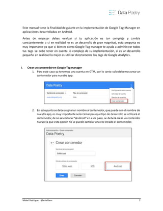 Este documento proporciona instrucciones para implementar Google Tag Manager en aplicaciones Android. Explica cómo crear un contenedor en GTM y configurar variables, reglas y tags. También describe cómo enviar datos como nombres de pantallas, eventos y dimensiones personalizadas a través de DataLayer y configurar el seguimiento correspondiente en GTM. Finalmente, detalla los pasos para integrar el script de GTM en la aplicación Android.